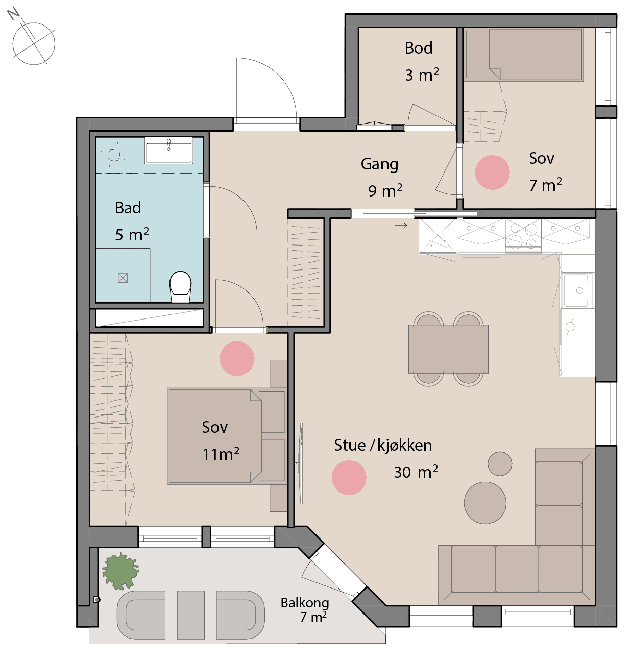 Rom markert med rosa sirkel har grunnet dagslyskrav begrensninger når det gjelder tilvalg på fargevalg.
