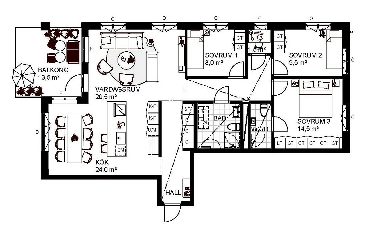Härlig fyra om 107,1 kvm som tar hela gaveln i anspråk vilket betyder härligt ljus från tre håll och balkong i västerläge. Riktigt stora och öppna ytor för kök och vardagsrum där en lika praktisk som stilig och stor köksö gör både kocken och middagsgästerna glada och delaktiga. Diskho, induktionshäll med infälld bänkfläkt samt en fin plats för minst två sittande. Ett stort matsalsbord får en naturlig och vacker plats utmed tre stora tätt placerade fönster. Tydlig privat del med tre sovrum varav master bedroom har badrum en-suite och de två andra har tillgång till ytterligare ett badrum där ni även finner en tvättavdelning. I bostaden finns även bra förvaring i garderober samt en klädkammare som även kan användas som en ostörd arbetshörna.