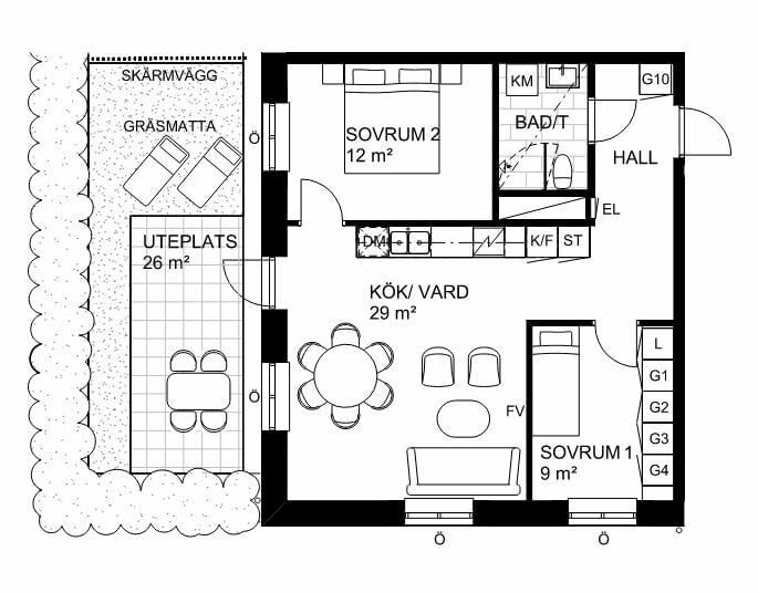 En klokt disponerad gavellägenhet i sydvästläge med många bra förvaringsmöjligheter i de båda sovrummen. Ljust och öppet samband mellan kök och vardagsrum där ljuset släpps in från två väderstreck. Stor uteplats mot väster. Stilrent kök med induktionshäll, inbyggnadsugn, mikro, diskmaskin och kombinerad kyl/frys. Helkaklat badrum med dusch och kombimaskin. Förråd i entréplan