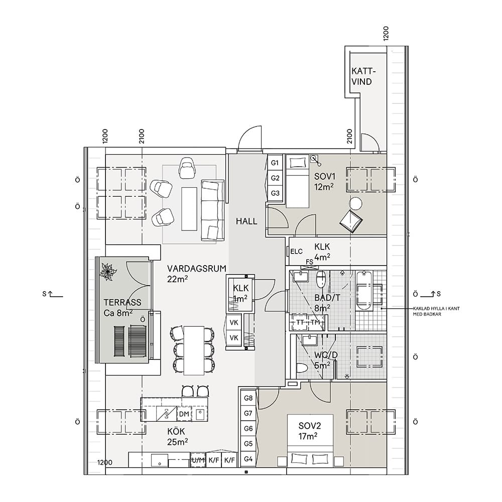 Nu kan du öppna dörren till ett hem fyllt av bekvämligheter och anmärkningsvärda attribut. Köket är utrustat med en härlig köksö, dubbla vinkylar och dubbla diskhoar. Tillsammans med vardagsrummet i semi-öppen planlösning mäter de sociala ytorna nästan 50 kvm. Och från dem når du den privata och västvända terrassen om 8 kvm med utsikt över takåsar och den gröna gården.
