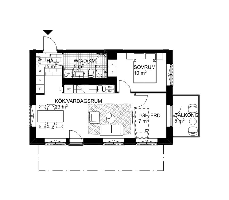 Här bor du i en ljus och flexibel tvåa. Den öppna utformningen mellan kök och vardagsrum skapar en naturlig plats för umgänge, middagar och vardagsliv. Här finns gott om utrymme för både matbord och soffhörna, och de stora fönsterpartierna i gavelläge släpper in fint dagsljus från flera väderstreck.