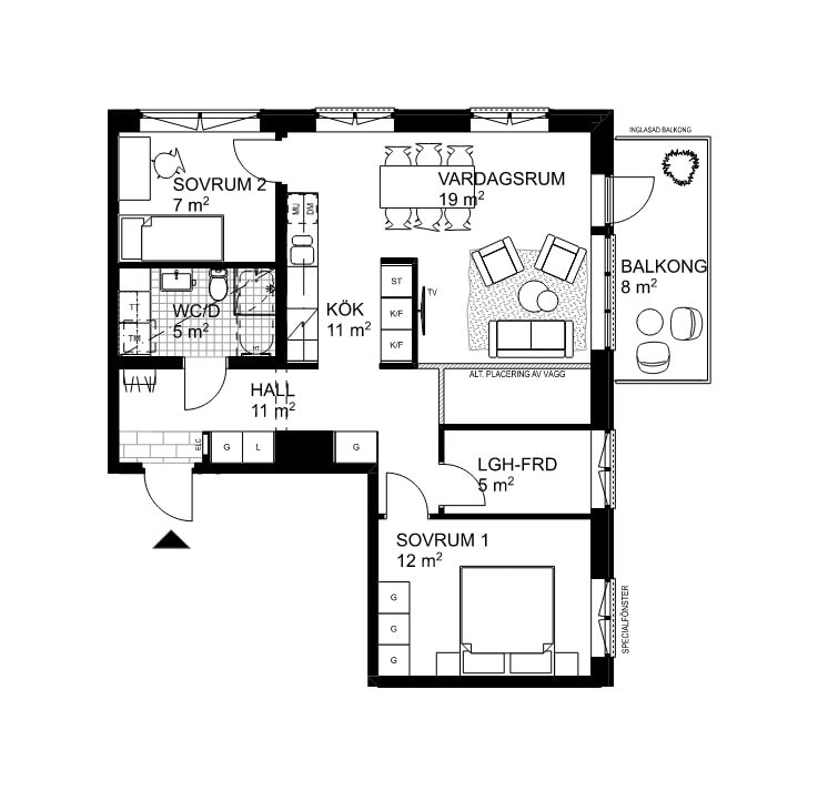De två sovrummen är placerade på varsin sida av bostaden för att ge en känsla av avskildhet. Det större sovrummet om 12 kvm erbjuder gott om plats för dubbelsäng och garderober, medan det mindre sovrummet om 7 kvm lämpar sig väl som barnrum, gästrum eller arbetsrum.