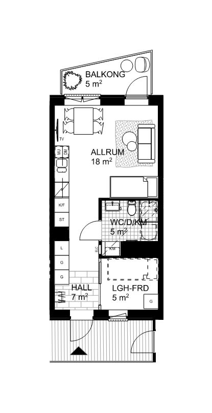 Hallen har plats för ytterkläder och skor samt förvaring i garderober. Direkt intill hallen finns dessutom ett praktiskt lägenhetsförråd. Förrådet har fönster och är så pass rymligt att det även kan inredas med exempelvis en säng, arbetsplats eller extra garderober perfekt för den som vill utnyttja ytan maximalt.