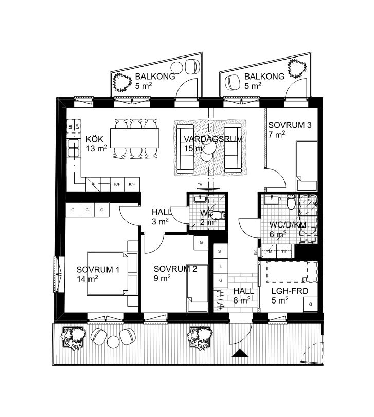 Kök och vardagsrum har en öppen planlösning. Köket är väldisponerat i vinkel och har gott om arbetsytor och förvaring. Två härliga balkonger öppnar upp bostaden från de sociala ytorna om man väljer bort ett av de mindre sovrummen. Väljer man hellre att ha sovrummet blir det fortfarande fina sällskapsytor och ett sovrum med utgång till ena balkongen.