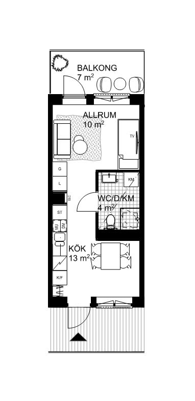 Välkommen till denna yteffektiva etta om 28 kvm. Bostaden nås via en entrébalkong som vetter mot föreningen innergård.