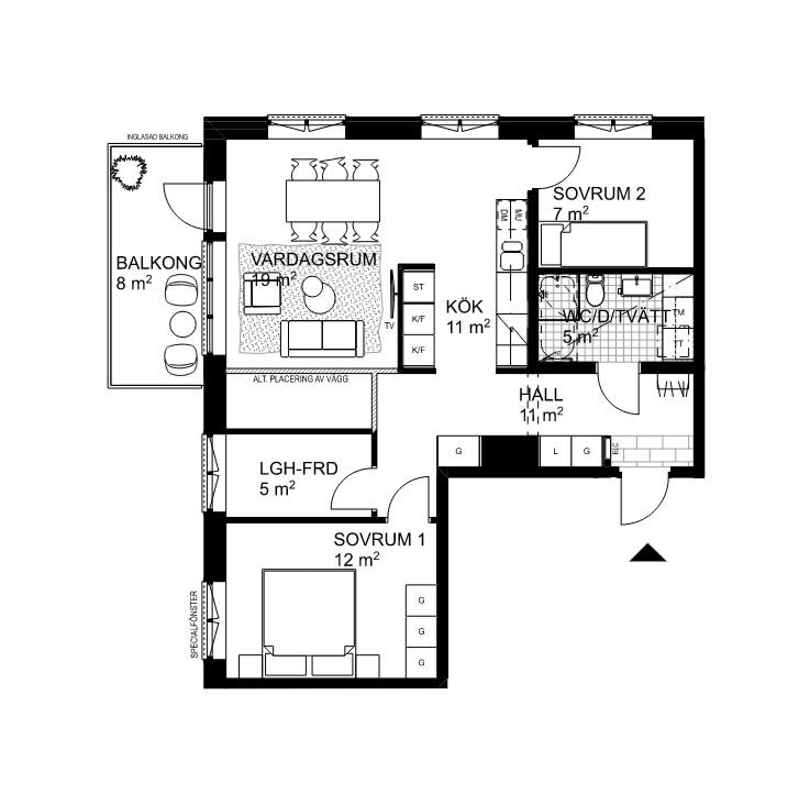 De två sovrummen ligger på varsin sida av bostaden för en privat känsla. Det större på 12 kvm rymmer dubbelsäng och garderober, medan det mindre på 7 kvm är perfekt som barnrum, gästrum eller arbetsrum.Badrummet är helkaklat och modernt med dusch, handfat, WC samt tvättmaskin och torktumlare en smart och bekväm lösning som underlättar vardagen.