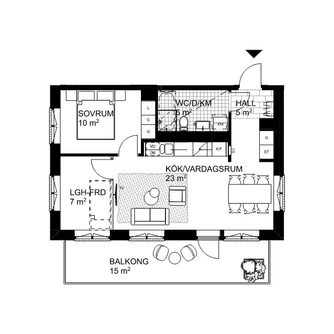 Bostadens stora fördelar är den fantastiska terrassen i soligt söderläge och det flexibla extrautrymmet. Här finns möjlighet att välja att ha en vägg och skapa ett separat rum perfekt som hemmakontor, barnrum eller förråd. Föredrar du i stället en mer öppen och luftig känsla kan du låta ytan vara en del av vardagsrummet och njuta av den generösa planlösningen.