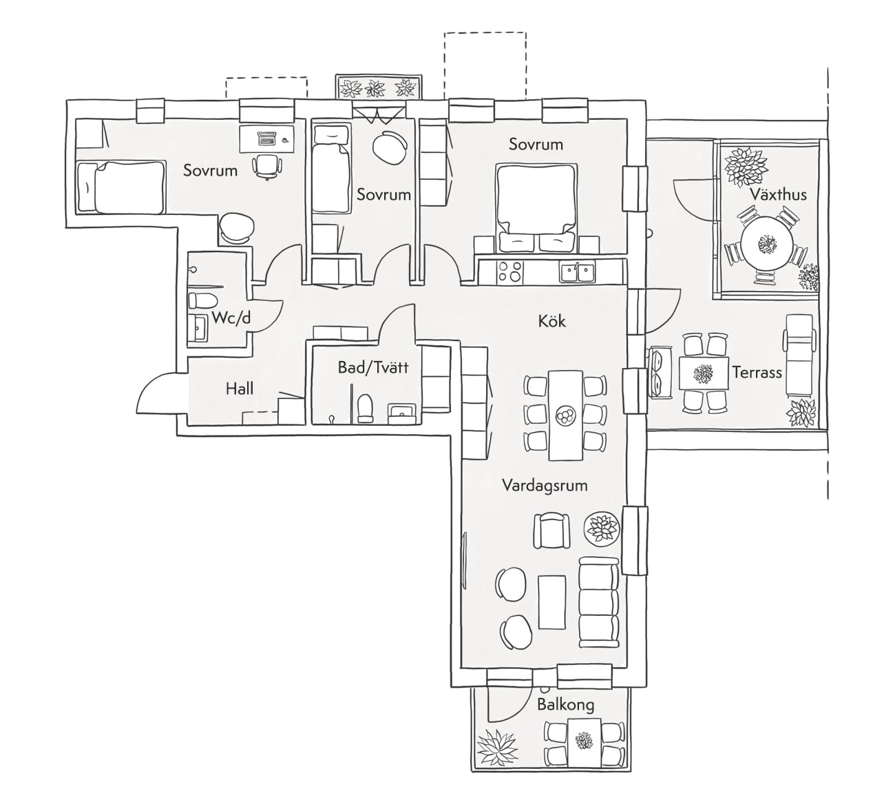 Här får du fyra rymliga sovrum, dubbla badrum, stor terrass i sydvästläge, eget orangeri i samma sydvästläge, fönster i tre väderstreck, en fransk balkong bara för att det är trevligt och härliga sociala ytor med utsikt över vad som kommer att kännas som lägenhetens lilla trädgård. Så om du börjar tröttna på att ta hand om villatomten – men ändå uppskattar en vacker utemiljö och dina hemmaodlade tomater – så kan den här lägenheten vara något för dig.