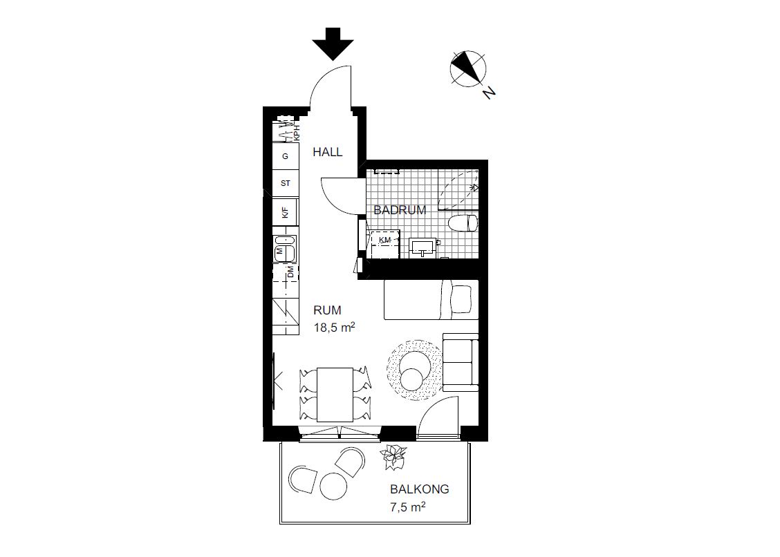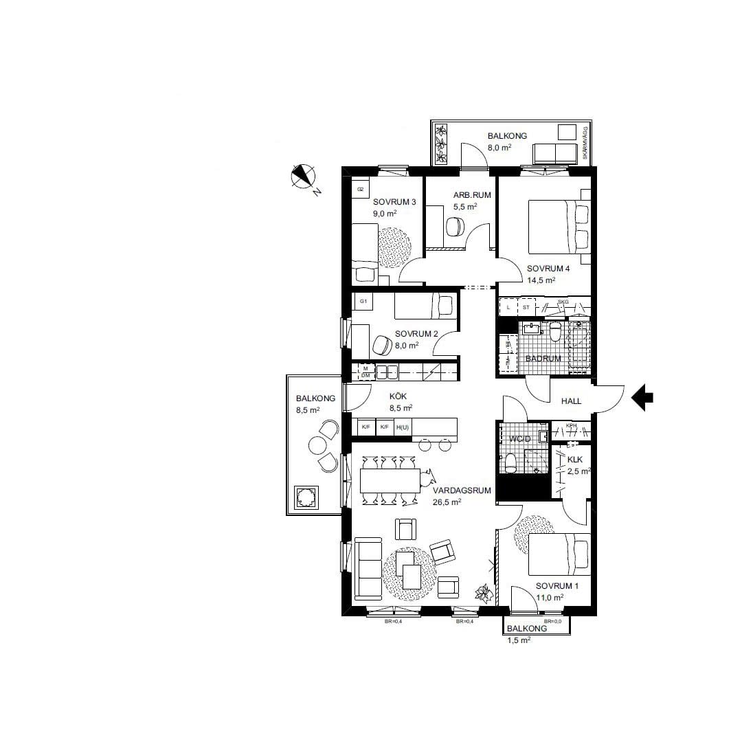 På husets motsatta gavel hittar vi sexorna på 115 kvadrat – och de har balkonger i hela tre väderstreck. Här finns även möjlighet att välja bort en vägg för att slå ihop två mindre rum till ett större.